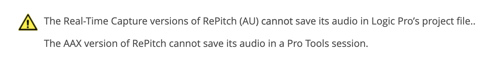 The AAX version of RePitch cannot save its audio in a Pro Tools session.