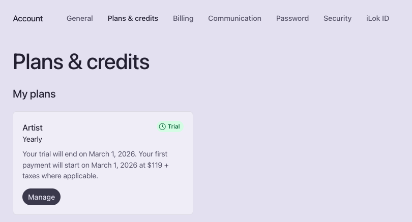 Manage Your Subscription: Look for the "My plans" area. You should see your active trial listed (e.g., "Synchro Arts - Artist"). Click the "Manage" button associated with it.