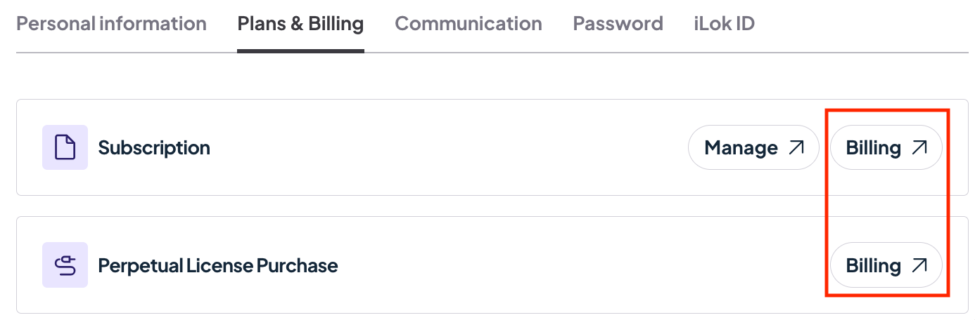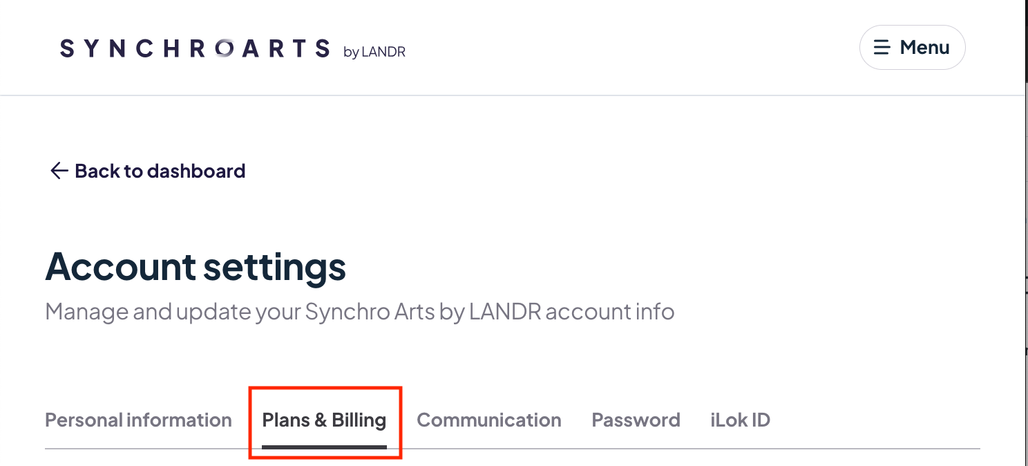 In the Plans & Billing tab, you will have two options available, leading to their own billing portals - Subscriptions are managed by LANDR/MusicPay, where perpetual licenses are managed by Synchro Arts.