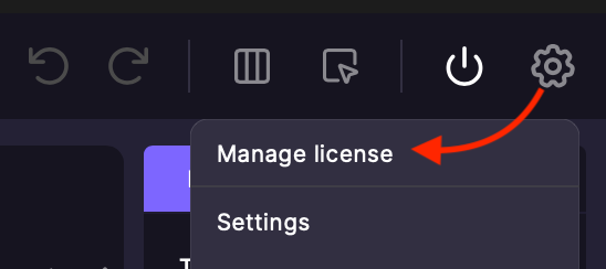 - Click the gear icon in the top right corner of the plugin interface, and choose "Manage License"